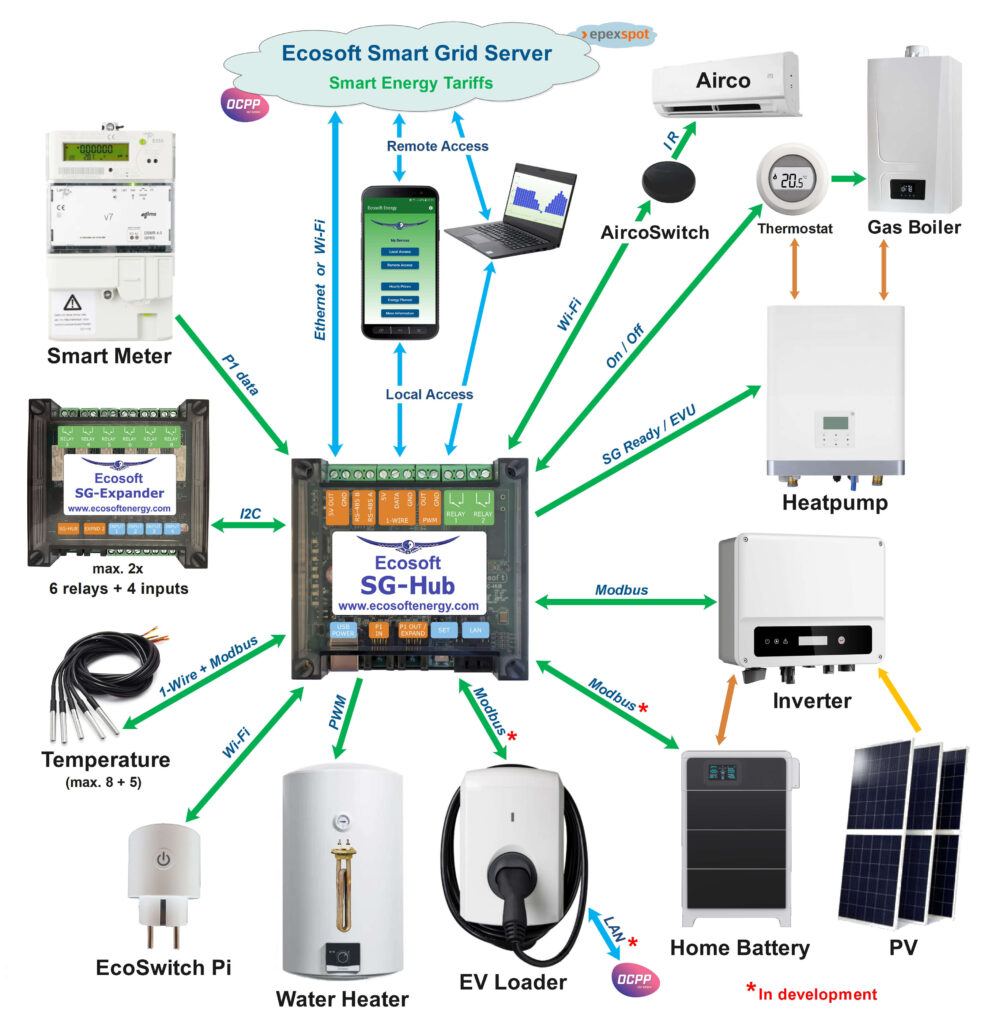The Ecosoft SG-Hub is a smart switch with two relays, WiFi, ethernet and other connectors. The Hub is intended to control connected devices to save energy costs. It is suitable for among others heat pumps, hybrid heat pumps, heat pump boilers and PV-systems.