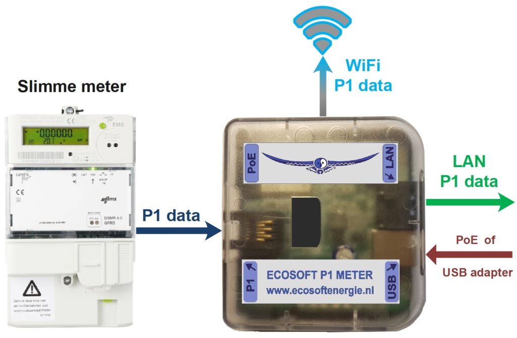 The P1 meter can pass on the data to Ecosoft devices and other devices. This makes it possible to better regulate energy consumption. For example, the P1-meter reads when energy is fed-in to the grid, and sends this information to an Ecosoft Smart Grid Controller, which switches on a heat pump to immediately benefit from the produced solar energy.