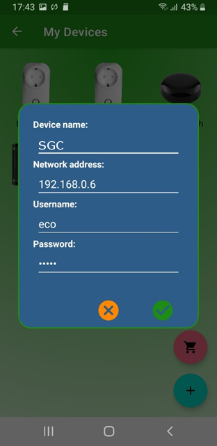 Then add the SGC 1 to the Devices list of the app. Press the + symbol. Then you can fill in the following information of the SGC 1: