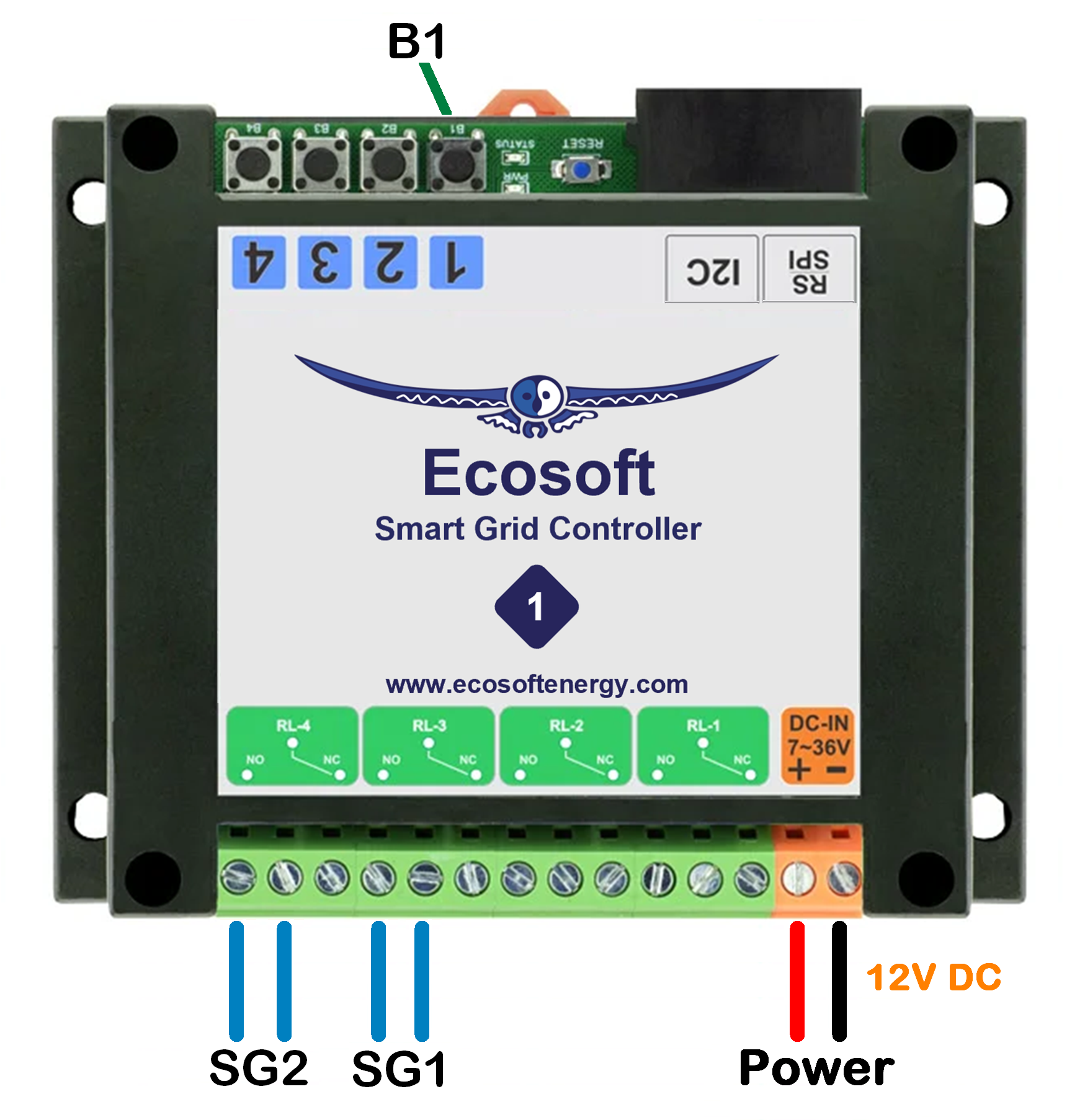 The Smart-Grid Controller is designed to control the SG-mode of a heat pump. Relay 3 and 4 (RL-3, RL-4) of the controller are intended to be connected to the Smart-Grid ready interface of the heat pump. These are marked in the diagram below as SG1 and SG2. The Smart-Grid interface defines 4 modes (halt, normal, boost, max). If the heat pump only supports EVU (only 2 modes: halt, normal), then connect SG1 only, and do not configure the boost and max modes in the Smart-Grid Controller energy plan.
