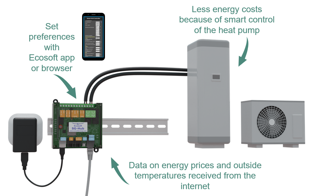 The Ecosoft SG-Hub is a smart switch with two relays, WiFi, ethernet and other connectors. The Hub is intended to control connected devices to save energy costs. It is suitable for among others heat pumps, hybrid heat pumps, heat pump boilers and PV-systems.