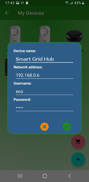 Then add the SG-Hub to the Devices list of the app. Press the + symbol. Then you can fill in the following information of the SG-Hub: