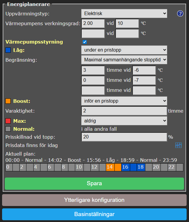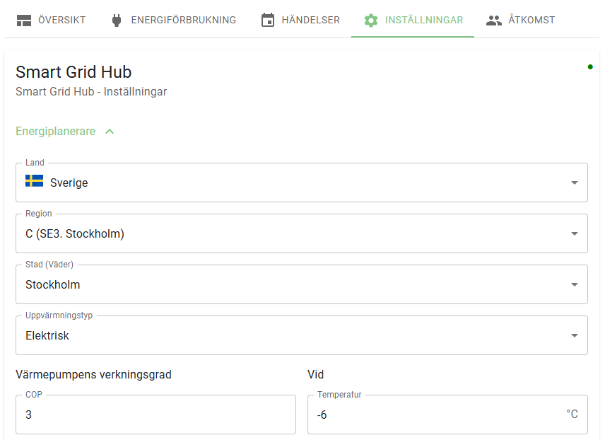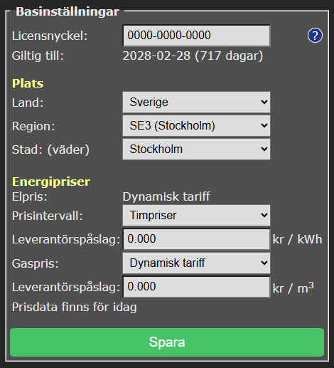 You can choose your Swedish energy price region: SE1 (Luleå), SE2 (Sundsvall), SE3 (Stockholm) or SE4 (Malmö). And for Smart Grid Controllers and AircoSwitch devices you can select a city in Sweden for weather data. This is applicable for controlling heat pumps and ACs in a cost effective way.