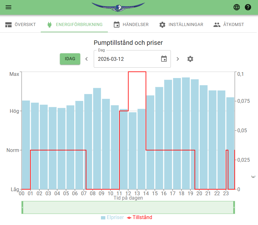 With a valid license key, data received from the Ecosoft device is stored in the Ecosoft cloud, where you can view graphs to monitor the performance of the system. For example, the states of the heat pump and prices at the time.
